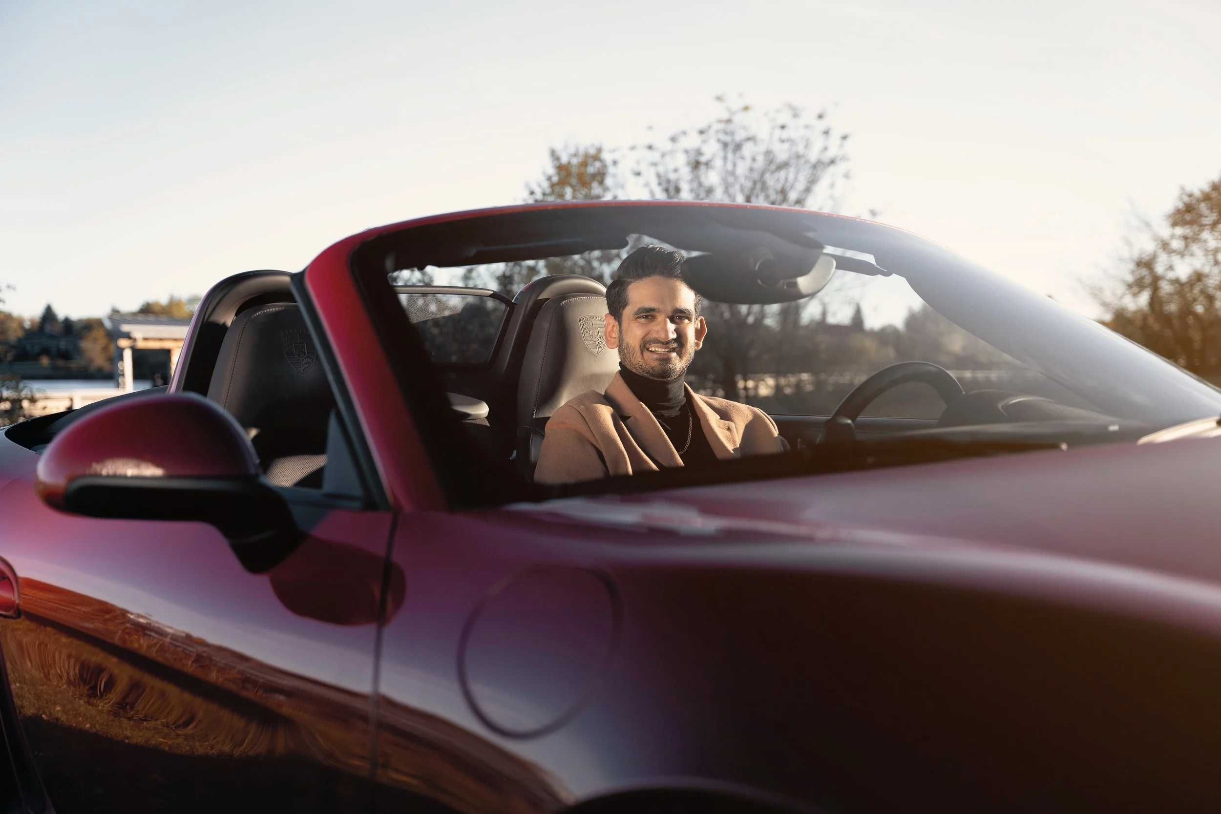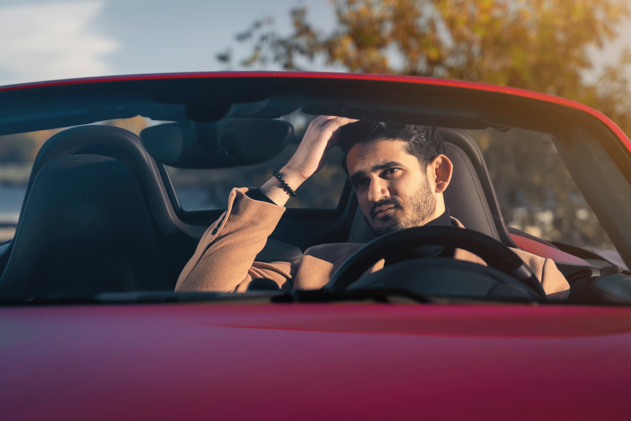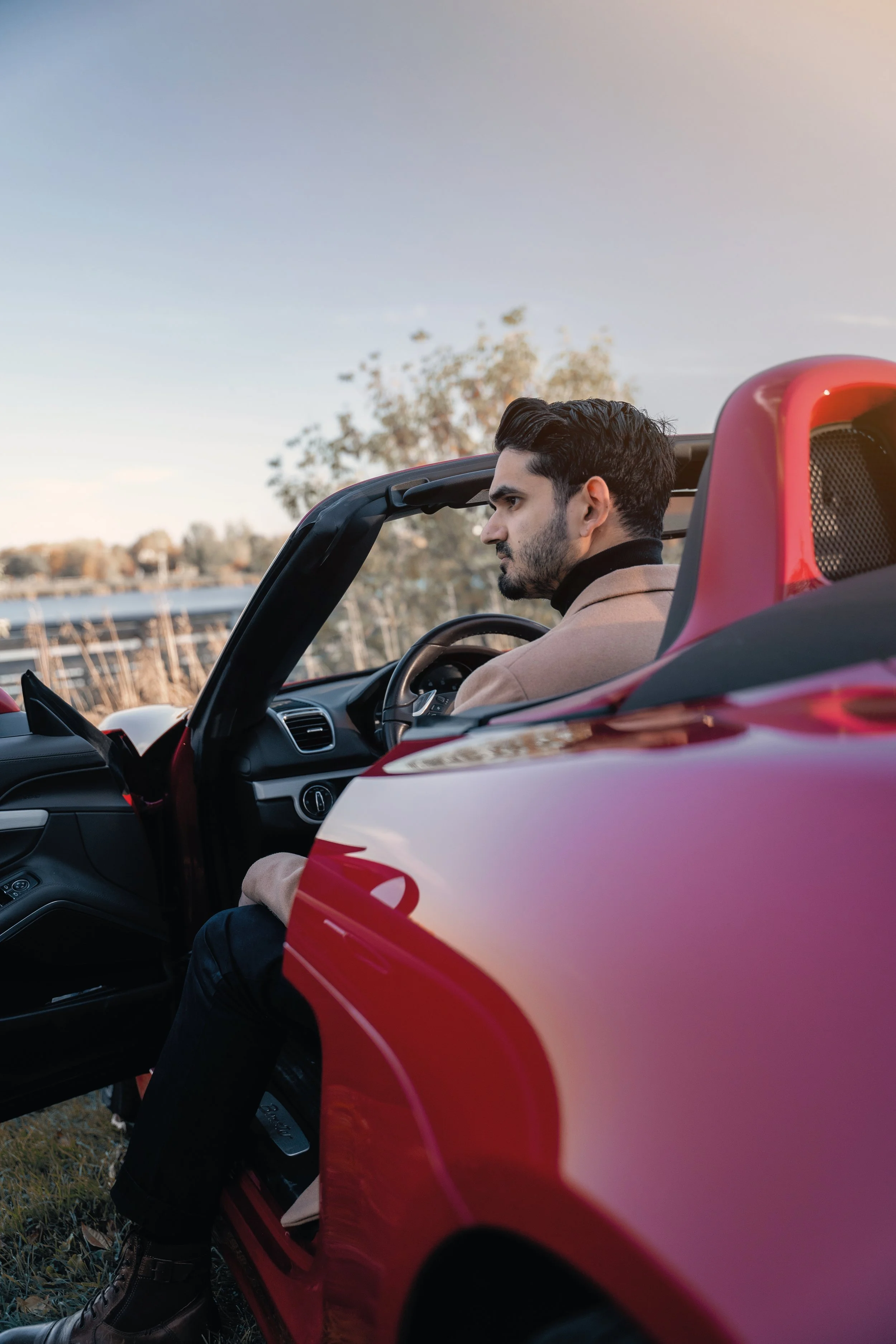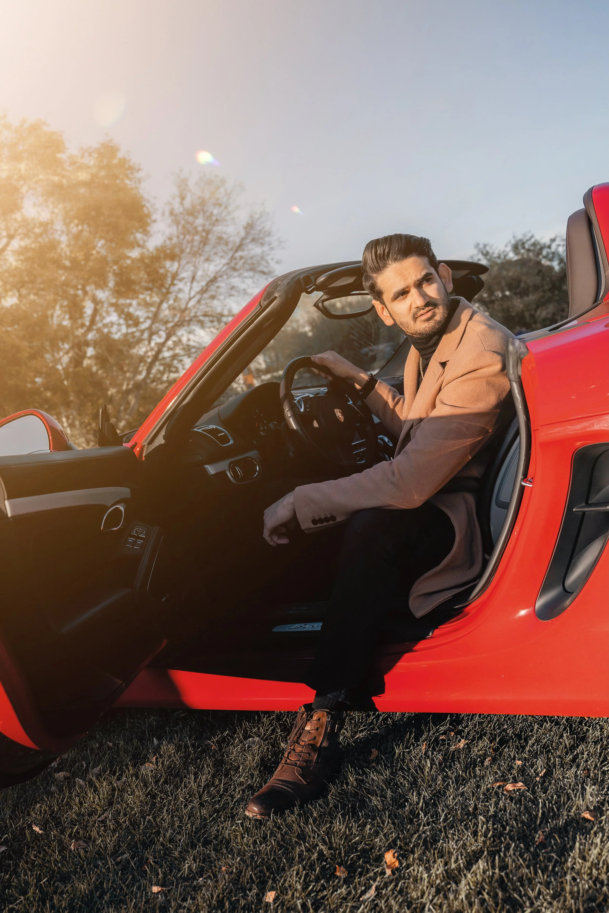 As we progressed through the session, the golden hour approached, casting a soft, warm glow over the scene. This magical lighting highlighted every curve of the Porsche and complemented Ashwin’s thoughtful poses. I made sure to take a variety of shots, from dynamic angles that emphasised the car’s sportiness to more candid images of Ashwin enjoying the moment.