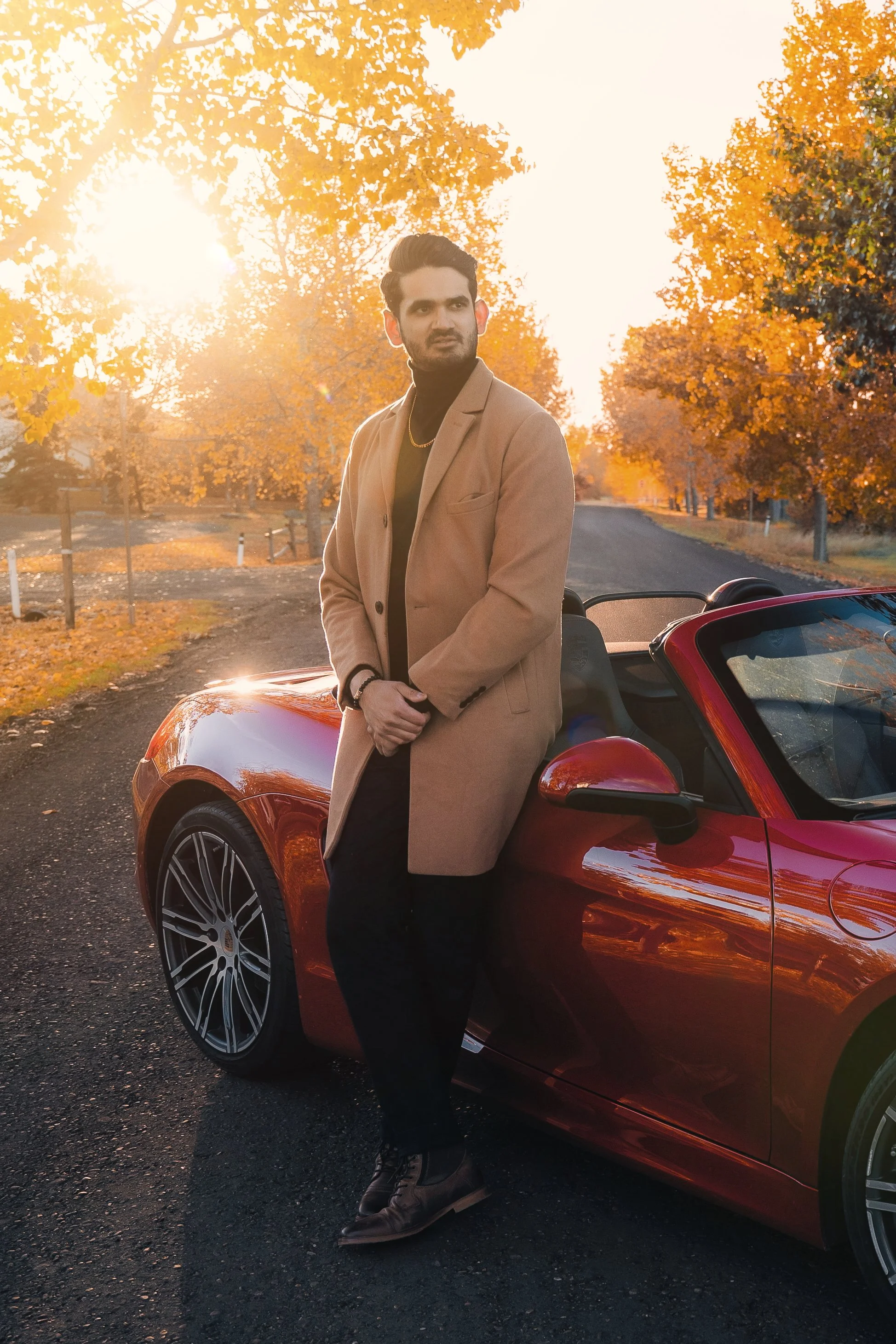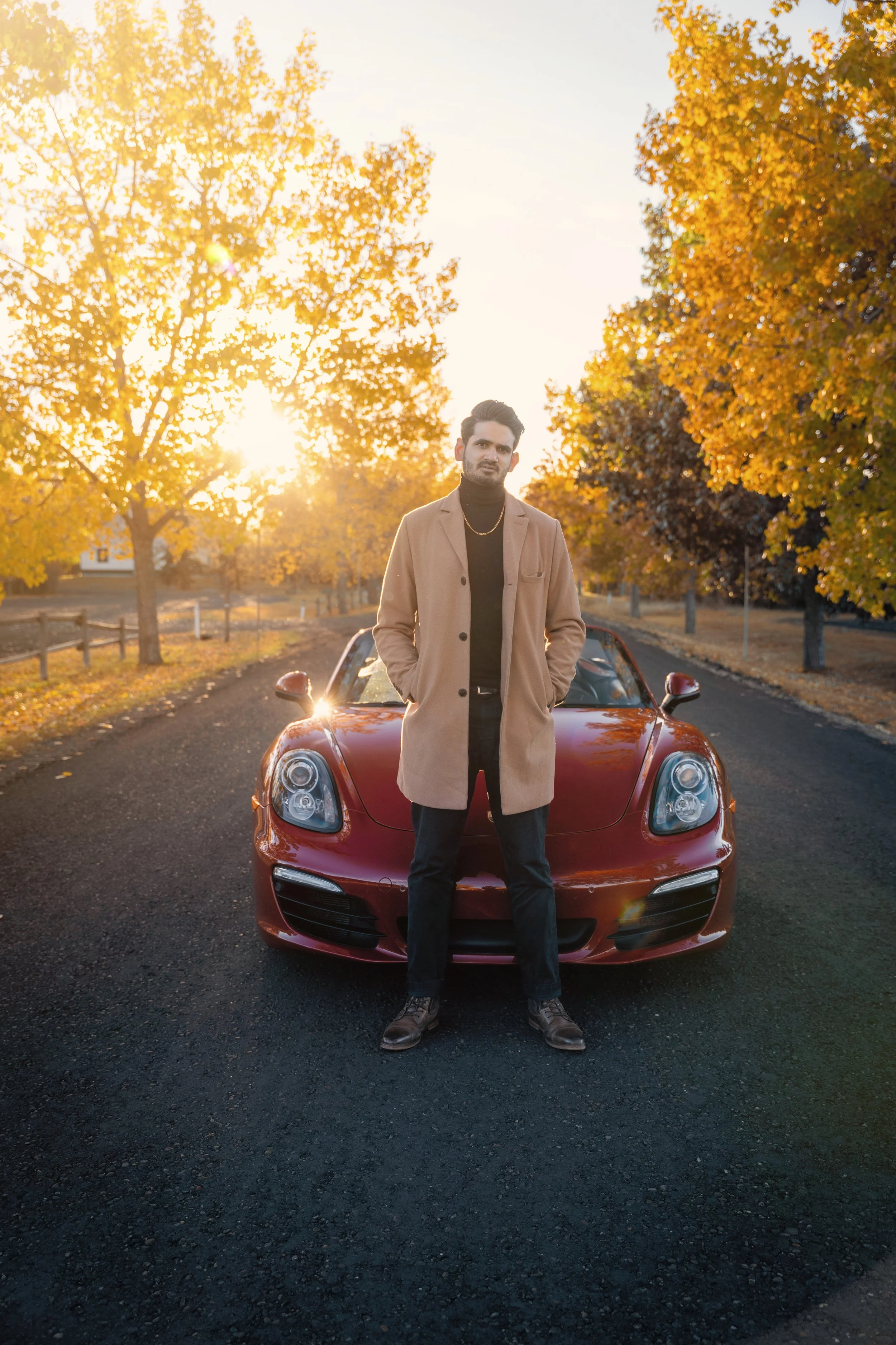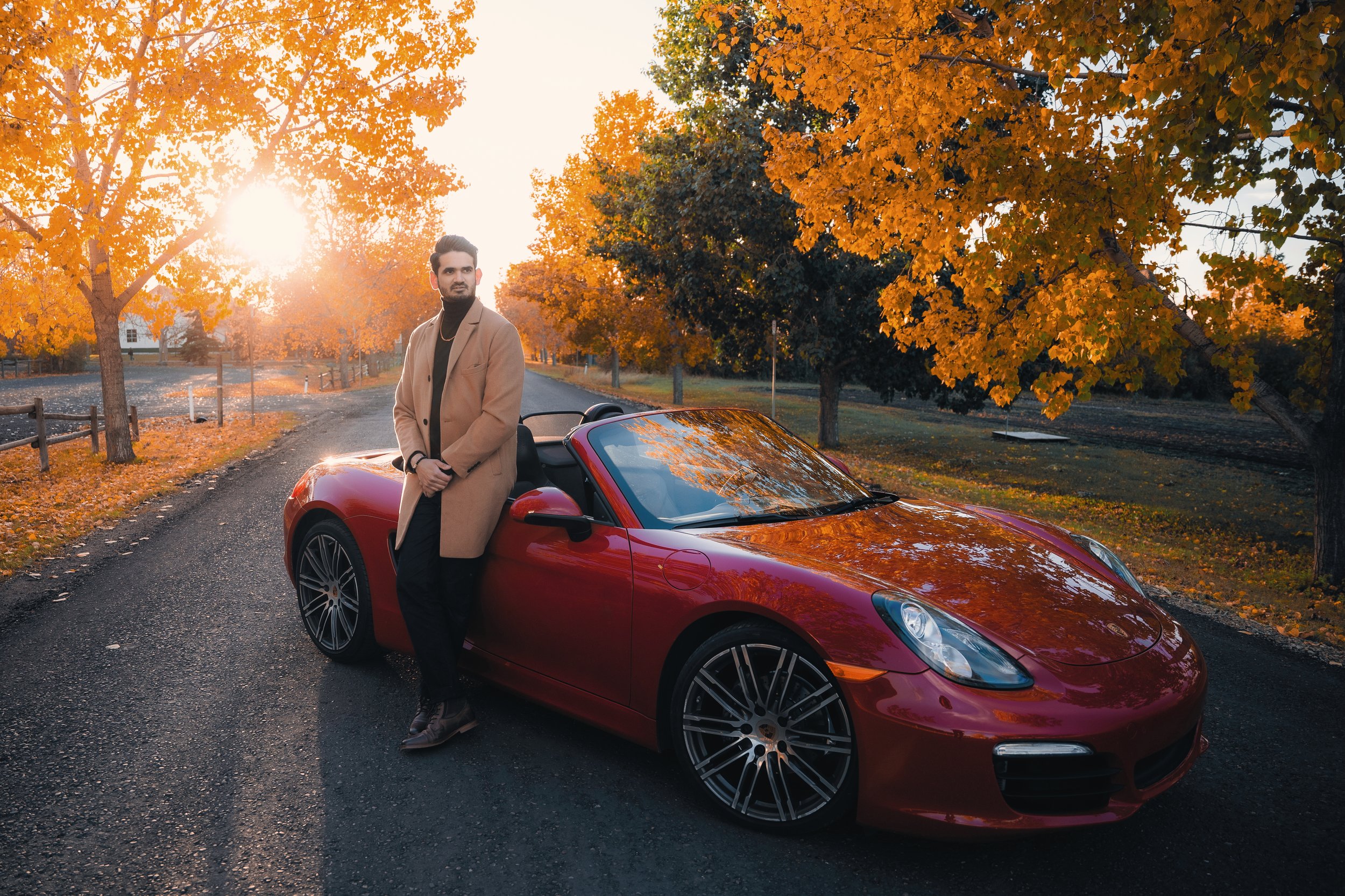As the sunlight filtered through the trees, illuminating the brilliant reds, oranges, and yellows, Ashwin's Porsche stood out strikingly against the landscape. The sleek lines of the car mirrored the elegance of the surrounding nature, creating a harmonious blend of man and machine in a picturesque setting.